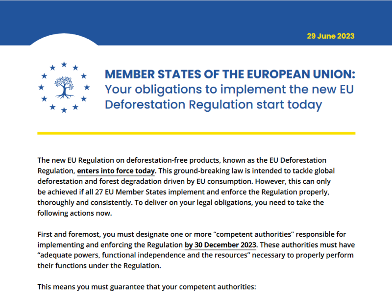 Open letter: Member States of the EU: Your obligations to implement the new EU Deforestation Regulation start today